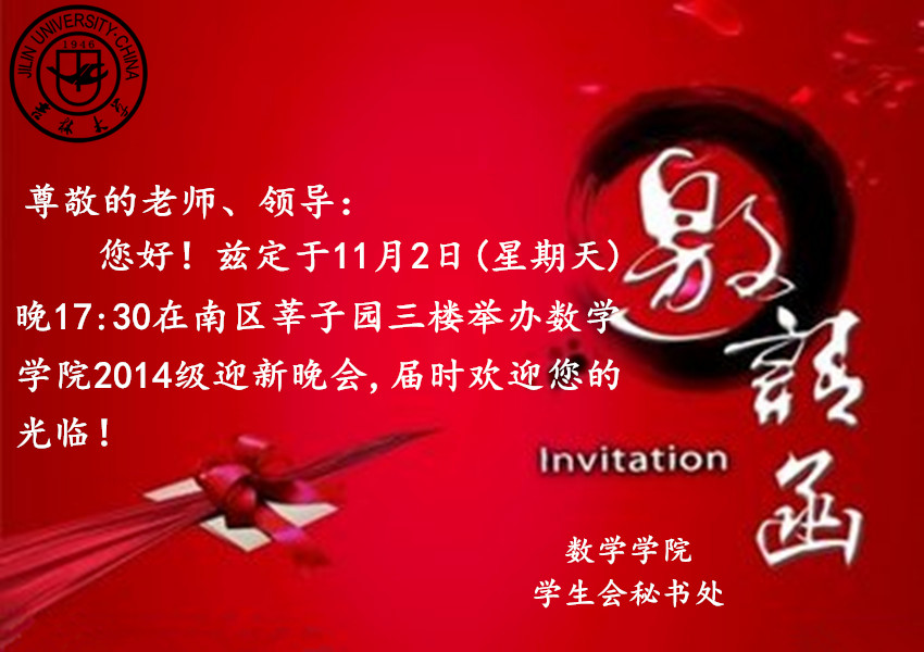 尊敬的老师、领导: 您好!兹定于11月2日(星期日)晚15:30分在南区莘子园三楼举办新葡的京集团88142014级迎新晚会,届时欢迎您的光临! 新葡的京集团8814学生会秘书处