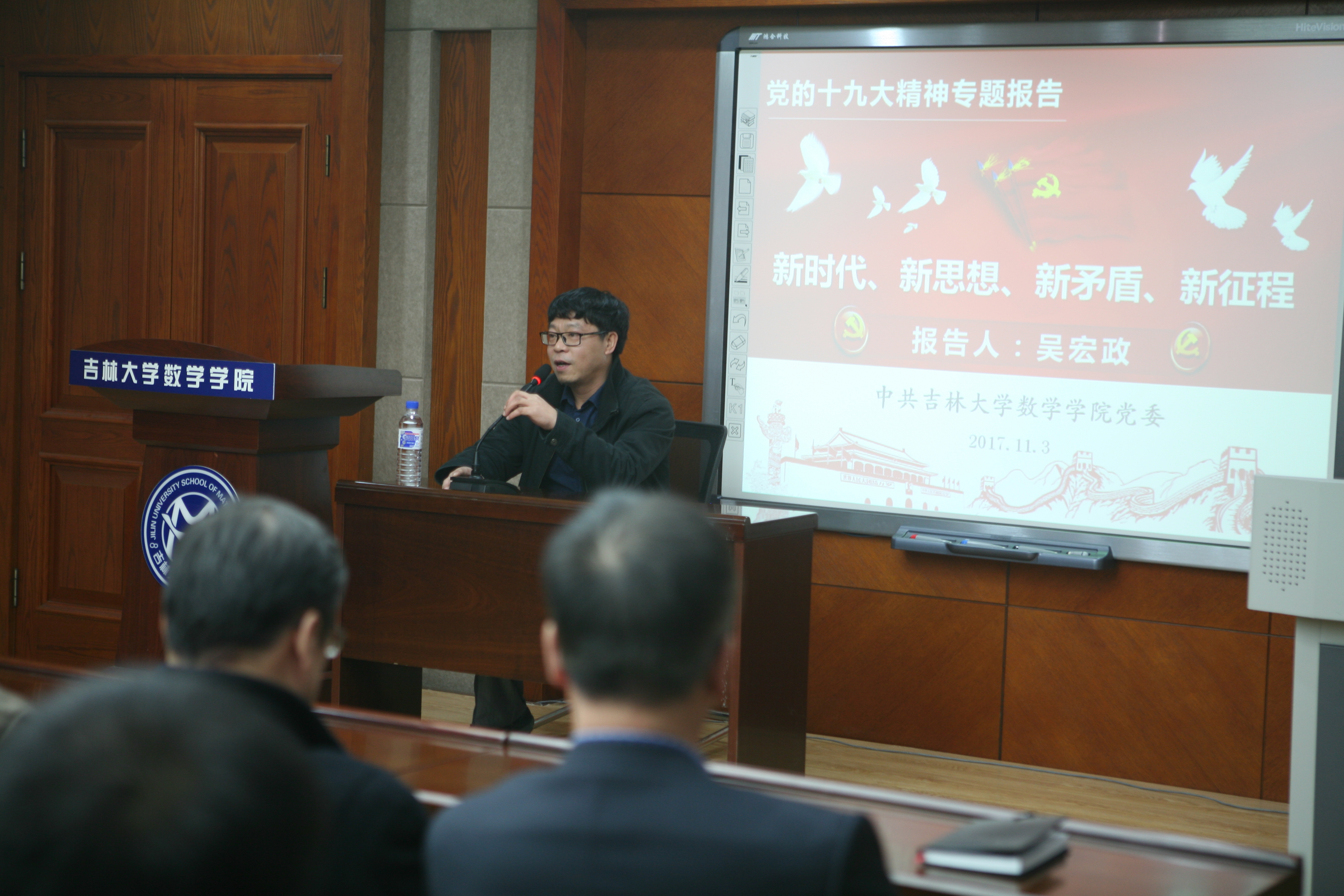 为深入学习贯彻党的十九大精神, 2017年11月3日下午1:30分,新葡的京集团8814党委邀请了“新葡的京集团8814党的十九大精神宣讲团”成员、马克思主义学院副院长吴宏政教授为学院全体党员做了题为《新时代新思想 新矛盾 新征程》的专题学习辅导报告。学院领导班子成员、党委委员、教工党员、学生党员代表、部分民主党派和无党派人士参会。