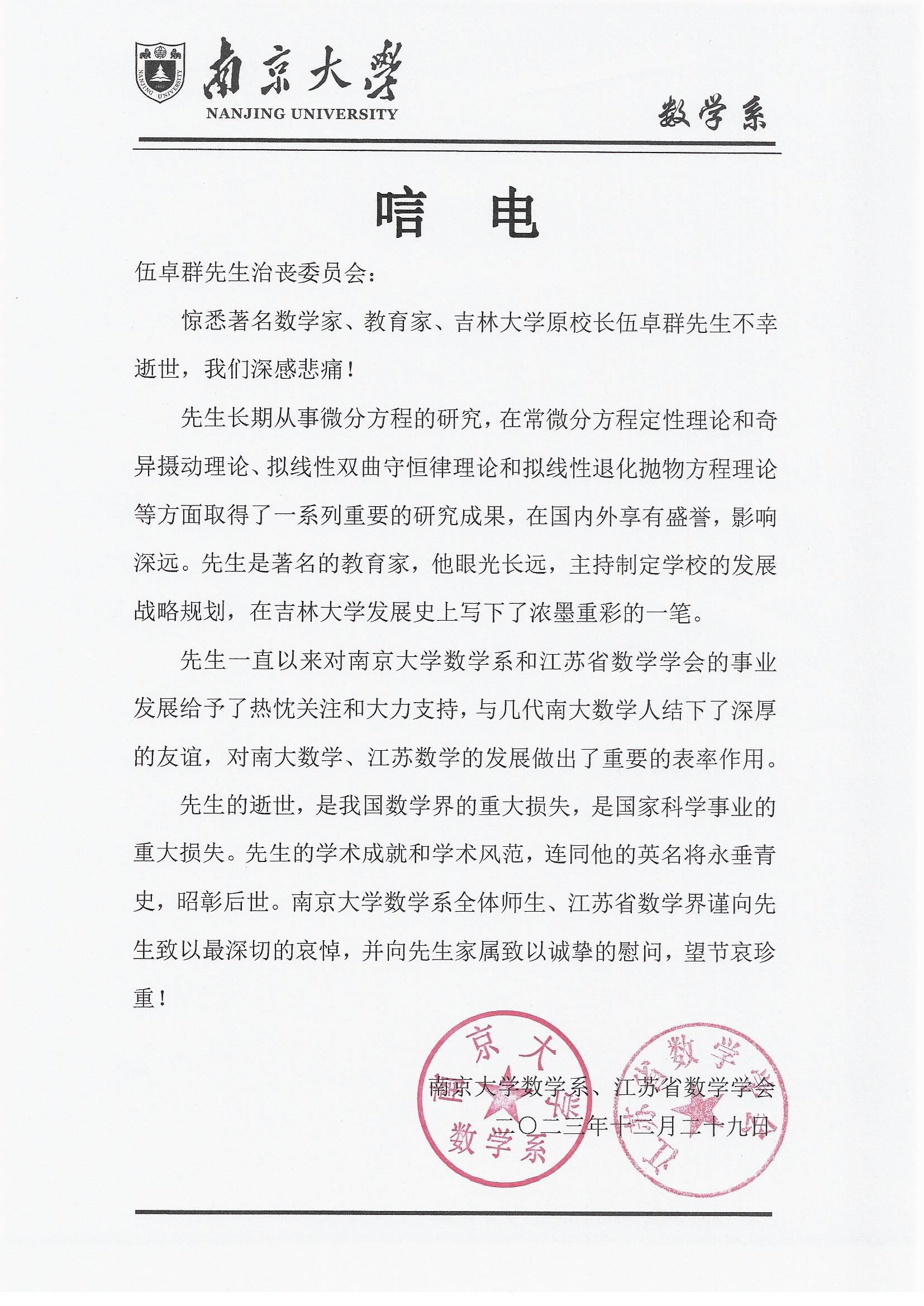 南京大学数学系、江苏省数学学会唁电